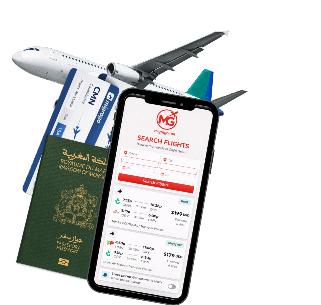 يمكنك حجز رحلتك بسهولة عبر MIGRAGO من خلال اختيار بلد الانطلاق، وجهة السفر، تاريخ الرحلة وعدد المسافرين. نقوم بعرض أفضل عروض رحلات الطيران المتوفّرة لتختار ما يناسبك من حيث السعر ومدة الرحلة.